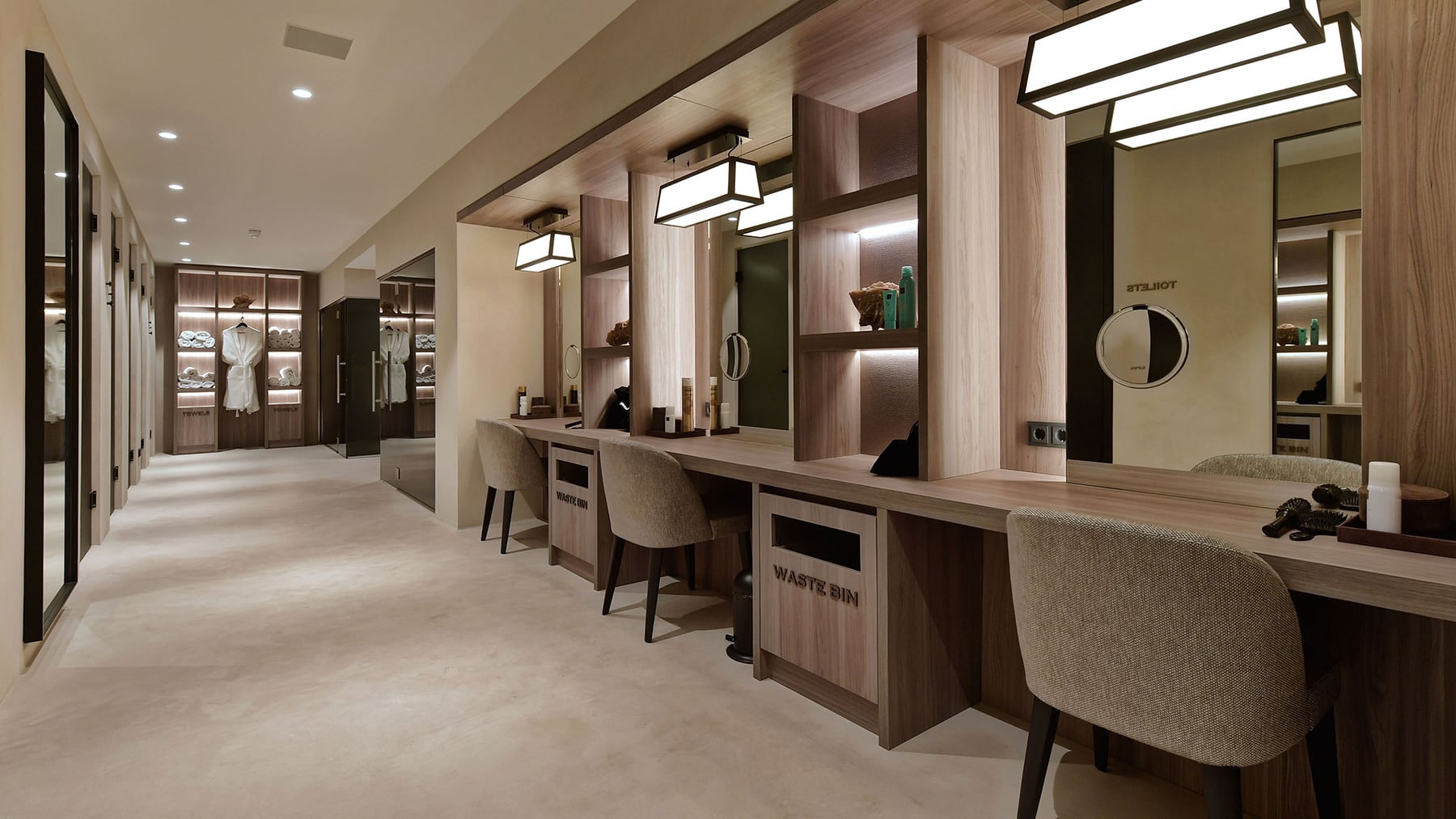 Luxury dressing room at Bernardus Golf with white bathrobe, rolled towels, and stylish decoration